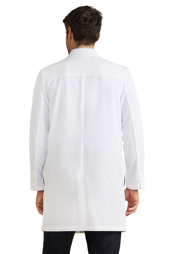 تصميم عصري وطول كامل مع إغلاق أمامي بأربعة أزرار. يوجد طوق ذو طية صدر مدببة لتصميم معطف المختبر الكلاسيكي. توجد سبعة جيوب للتخزين المنظم: جيب واحد على الصدر، وجيبان أماميان، وجيب بسحاب فوق الجيب الأمامي الأيمن، وجيب خلوي داخل الجيب الأمامي الأيسر، وجيبين داخليين (جيب واحد على الجانب الأيمن لمرتديه، جيب واحد على الصدر الأيسر لمرتديه). تحتوي الجيوب الأمامية